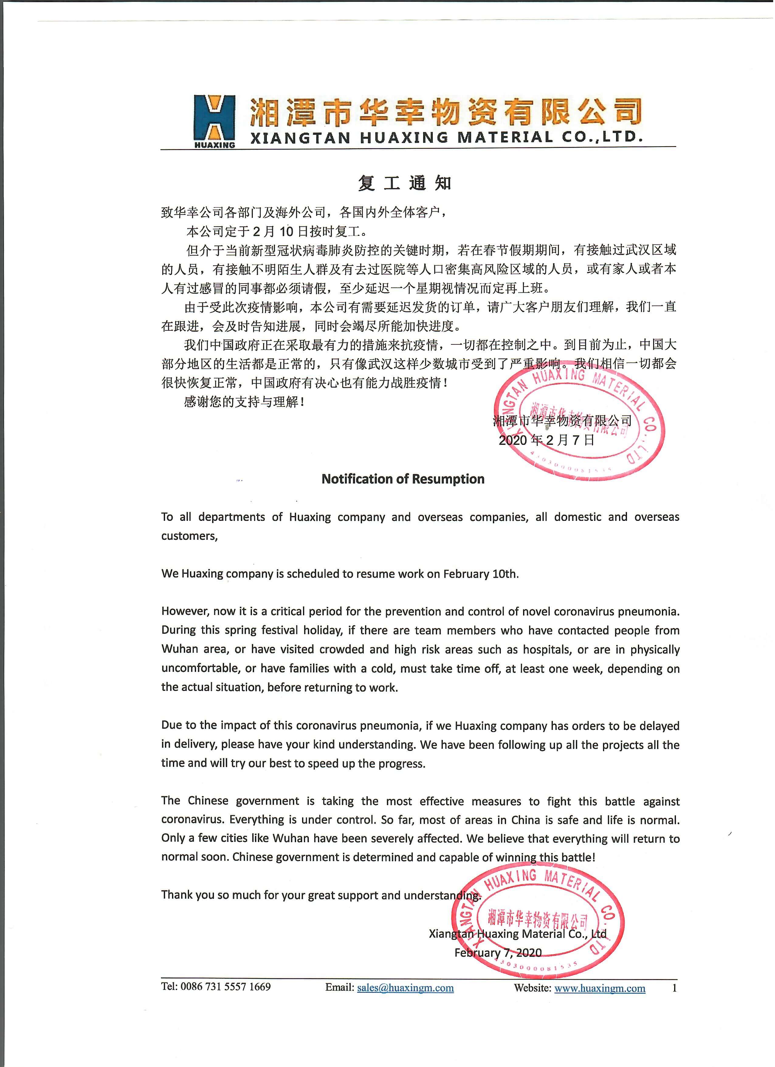 Notificación de reanudación de Huaxing de la siguiente manera: